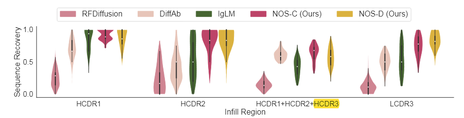 Sequence recovery는 주어진 정답(ground truth) 서열을 얼마나 맞췄는지를 정량화한 것이다. 하지만 generation task에서 recovery가 얼마나 큰 의미를 주겠는가? OAS database에 있는 서열을 모두 복원할 수 있다면 창의성(새로운 약물)을 발휘할 수 있는 capacity는 전혀 없다는 것을 의미하는가? 하나 고무적인 것은 구조 정보를 학습에 사용하지 않고도 구조 기반 생성 모델(RFDiffusion)과 구조-서열 co-design 모델(DiffAb) 보다 좋은 recovery 성능을 보였다는 것이다.