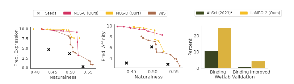 Naturalness는 자연에 존재하는 서열일 법한지, 세포에서 잘 발현이 될지 등 가능성에 대한 평가 지표이다. Naturalness와 expression yield 및 binding affinity 예측 값을 같이 놓고 보았을 때, 두 가지 특성을 모두 최적화하는 샘플들(Pareto optimal)은 WJS에서 naturalness에 치우치도록 생성한 반면 NOS는 desired property는 우수하지만 naturalness는 낮도록 샘플을 생성한다.