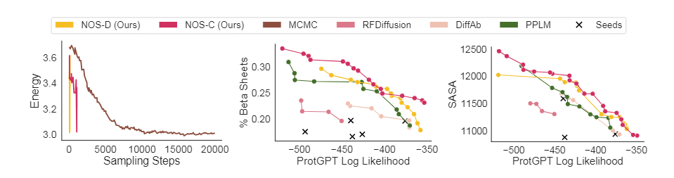 이 모델의 강력한 장점 중 하나는, multiple-objectives optimization이 가능하다는 것, 원하는 여러 개의 property를 만족하는 서열을 생성할 수 있다는 점이다. "Beta Sheets의 비율"과 "SASA (solvent accessible 면적, surface로 노출된 residue 면적을 의미한다)"을 충족해야 하는 조건으로 주고 서열을 생성했을 때 DiffAb와 MCMC 방법론 등 보다 낮은 energy를 가지는 서열로 수렴했다는 것을 보여준다.