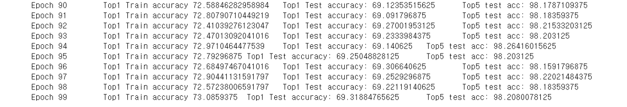 print(f"Epoch {epoch}\tTop1 Train accuracy {top1_train_accuracy.item()}\tTop1 Test accuracy: {top1_accuracy.item()}\tTop5 test acc: {top5_accuracy.item()}")