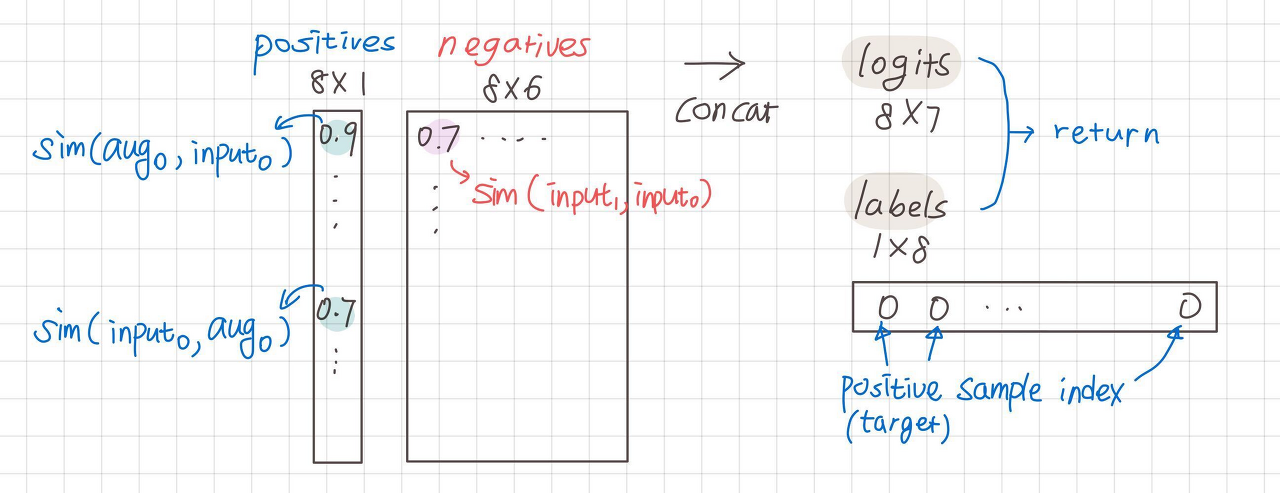 예를 들어 img1이 주어졌다고 했을 때, sim(img1, img1'), sim(img1', img1)을 positive sample로 선택하는 것입니다.